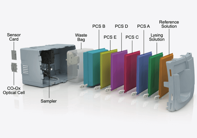 - pH, pCO2, pO2, Na+, K+, Ca++, Cl–, Glu, Lac, Hct, tHb, O2Hb, COHb, MetHb, HHb, tBili, sO2‡
